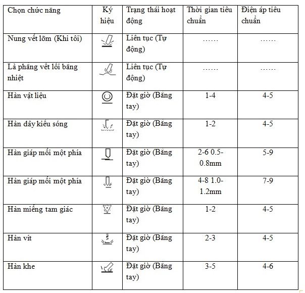 - Để cắt: Xoay công tắc chức năng tới kiểu tôi; (Đặt thời gian và điện áp nên điều chỉnh ở mức lớn nhất)