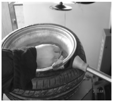 Người vận hành không được phép đặt tay lên các bánh xe khi đang thực hiện kẹp. Khi cột nghiêng về vị trí làm việc có thể tay sẽ bị kẹp lại giữa lốp và vành với đầu làm việc, như thế rất nguy hiểm.