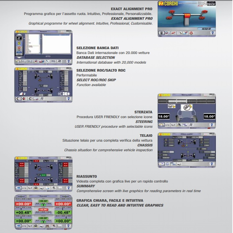 6. Phần mềm cân chỉnh độ chụm (góc đặt bánh xe) EXACT. Chương trình góc đặt bánh xe chuyên nghiệp bao gồm tất cả các chức năng theo yêu cầu của các chuyên gia về góc đặt bánh xe. Thủ tục tùy chỉnh, hình ảnh động cho hỗ trợ điều chỉnh, tương thích với mạng Asa và Romess. Luôn luôn được cập nhật đầy đủ thông số xe.