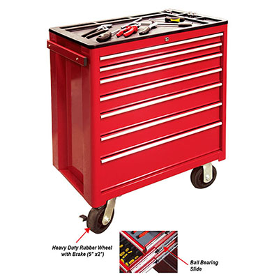 Tủ đựng đồ nghề 7 ngăn kéo, có khóa và bánh xe, tiện lợi di chuyển trong xưởng. Mặt bàn kiểu khay để dụng cụ. Sơn tính điện màu đỏ