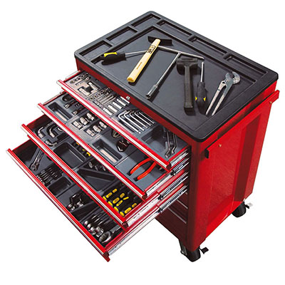 Thùng đồ nghề 7 ngăn kéo và khay đồ, đầy đủ 248 chi tiết với thiết kế mặt bàn kiểu khay để dụng cụ có bánh xe di động có khoá hãm được sơn tính điện mầu đỏ đẹp mắt chống rỉ